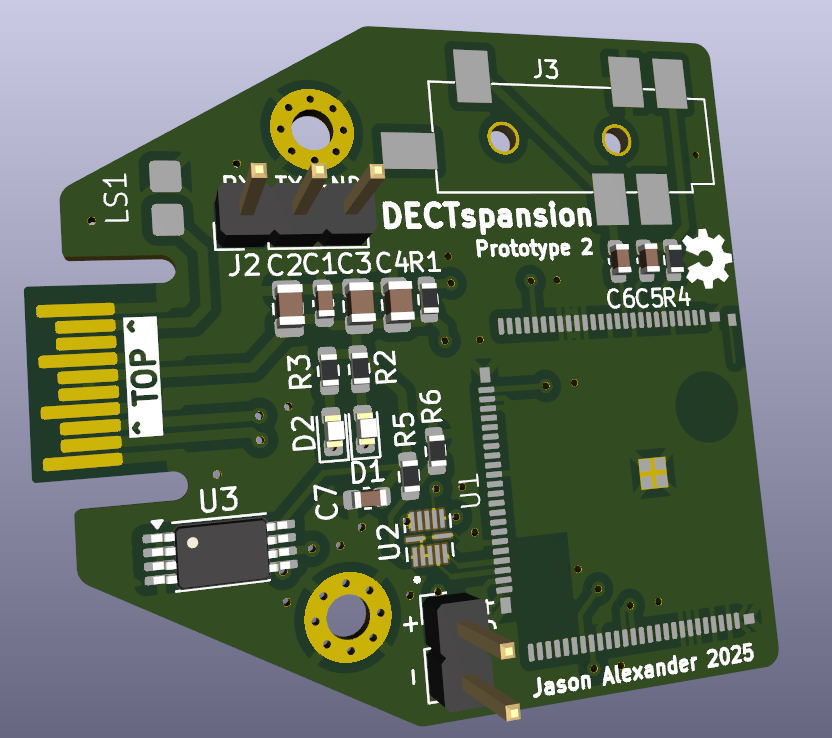 DECT module for the Tildagon badge. Requires a headphone (audio) connection. Design builds on the SC14CVM DECT devboard and the EMF hexpansion. Early prototype. License: CERN-OHL-S-2.0.